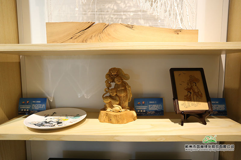 負一層展廳內(nèi),不僅循環(huán)播放著臺州城市形象、旅游景區(qū)、山海風(fēng)光、生態(tài)文明建設(shè)、“兩山”理論成果的宣傳片,還展示了臺州特色的茶葉、烏藥黃精、楊梅制品、無患子系列產(chǎn)品、木竹工藝品等特色林產(chǎn)品。