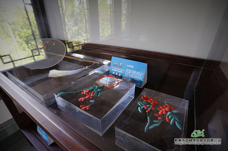 在以浙派民居為風(fēng)格的主題建筑“富春山居”內(nèi),展示著來自仙居的無骨花燈、溫嶺的石雕、黃巖的翻簧竹雕、椒江的臺州玻雕、臺州刺繡等精美的展品。
